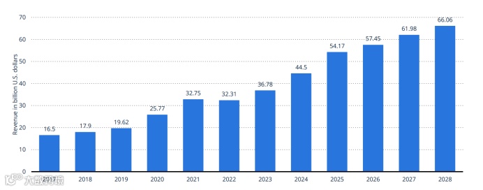 图:2017年至2028年巴西零售电子商务收入(以十亿美元计),Statista