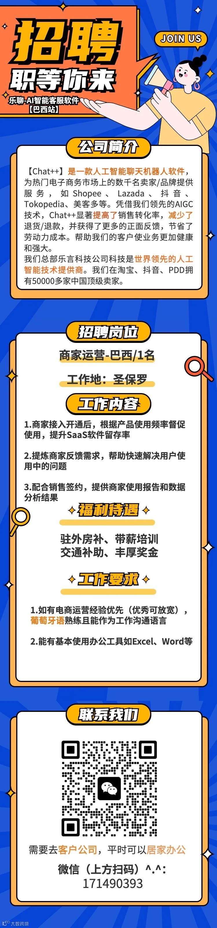 要求:具备基础葡语交流能力;有快消或门店仓储经验者优先;责任心强、服务意识好。