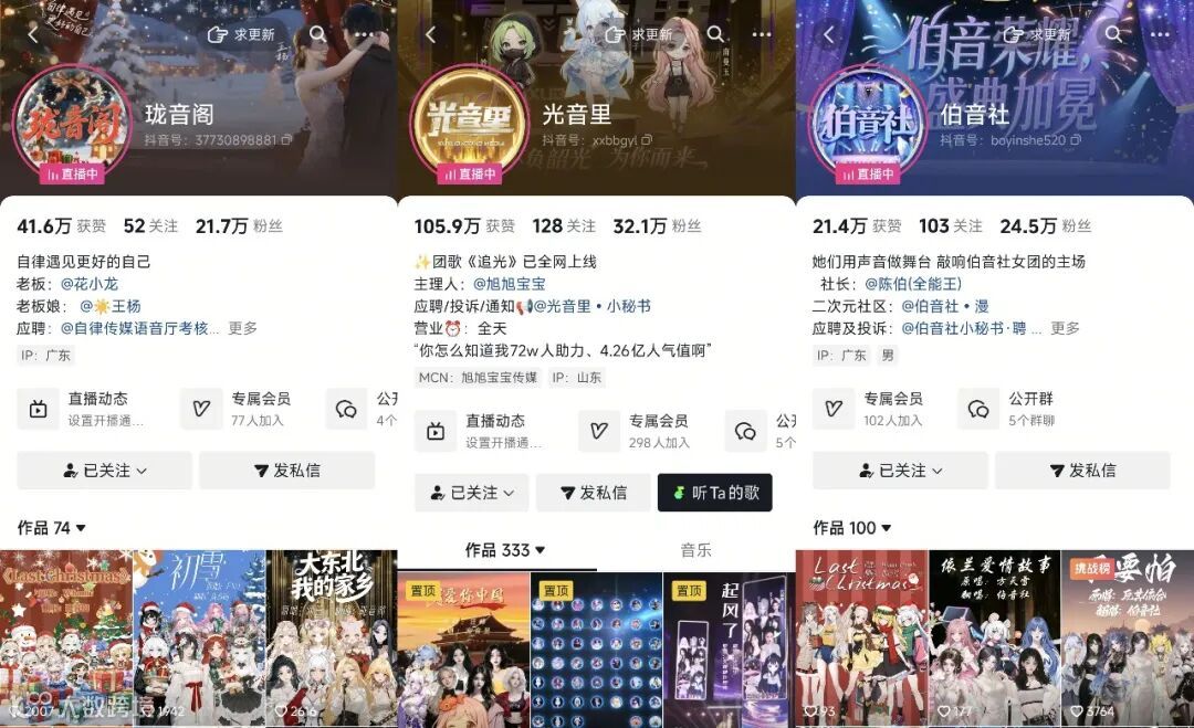 目前,除YY语音、TT语音、Soul等传统语音社交平台外,已涌现出听潮阁传媒、造梦师、自律传媒、旭旭宝宝传媒等一批专业语音厅公会。其中,听潮阁传媒员工近1000人,签约虚拟歌手超5000人,孵化13个高人气语音厅。