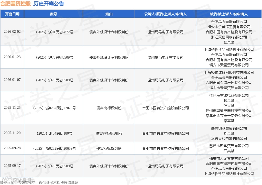 据天眼查APP显示,近一年内以合肥市国有资产控股有限公司为当事人的开庭公告共7则,其中“侵害外观设计专利权纠纷”4则,“侵害商标权纠纷”2则,“侵害商标权纠纷?”1则。