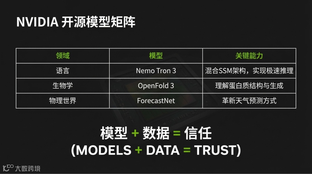 在 AI 模型领域,开源正在成为主流趋势。黄仁勋在演讲中强调 “开源崛起,创新在每一家公司、每个行业同时被激活”。英伟达构建了强大的开源模型矩阵,涵盖语言、生物学、物理世界等多个领域:Nemo Tron 3 采用混合 SSM 架构,实现极速推理;OpenFold 3 能够理解蛋白质结构与生成,推动药物研发革命;ForecastNet 革新了天气预测方式,使短期气象预报准确率提升 20%。