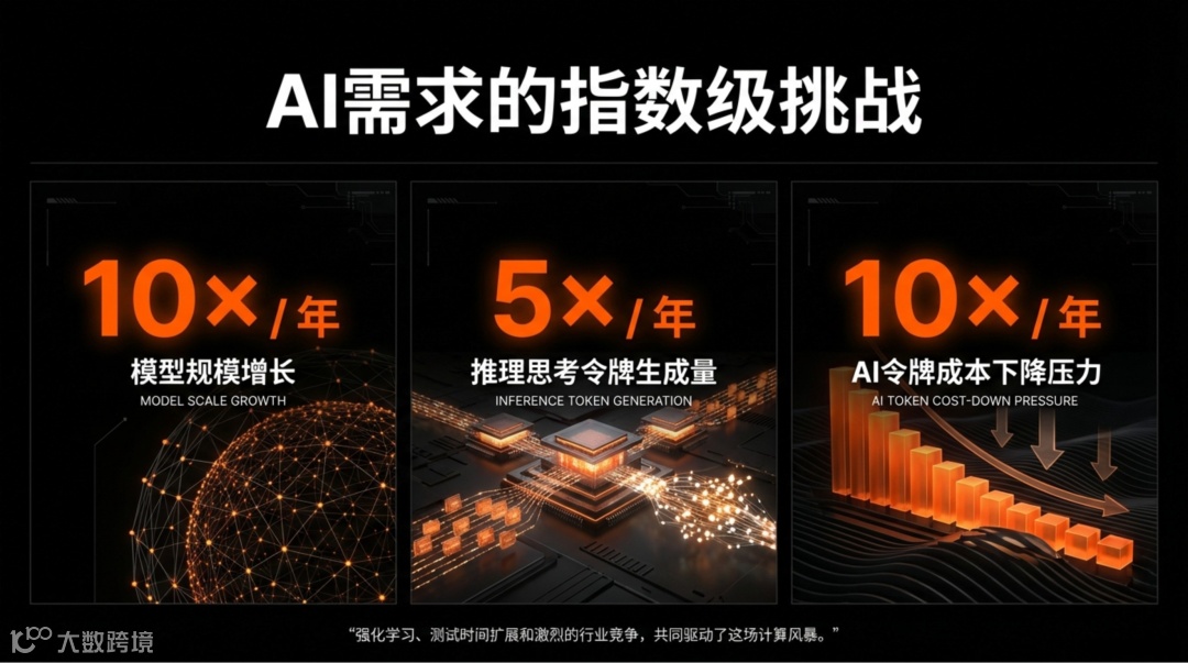 AI 技术的快速发展,带来了算力需求的指数级增长。黄仁勋在演讲中公布了一组触目惊心的数据:模型规模每年增长 10 倍,推理思考令牌生成量每年增长 5 倍,而 AI 令牌成本下降压力每年达到 10 倍。这种 “增长与成本” 的矛盾,使得传统计算架构不堪重负 —— 晶体管年度增长上限仅为 1.6 倍,远无法满足 AI 性能的增长需求。“传统之路已尽,” 黄仁勋强调,“如果行业要继续进步,除非部署激进的极端协同设计。”