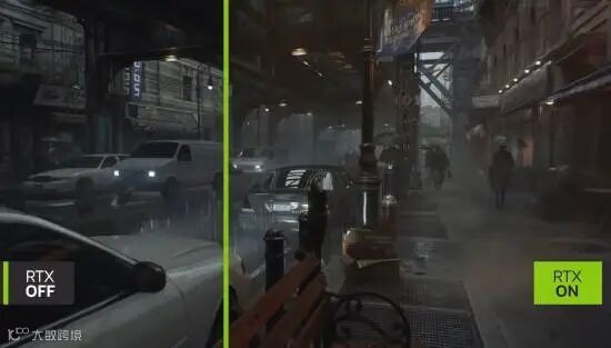 视频中同时展示了游戏在关闭光追和开启光追后的画面效果对比,可以清晰的看到开启RTX路径追踪前,游戏的整个画面都灰蒙蒙的,而开启后,光效不再是简单的明暗贴图,而是通过复杂的反射、折射与全局光照,呈现出极其逼真的光影层次。灯光的闪烁、水迹的角色倒影,都相当细腻。