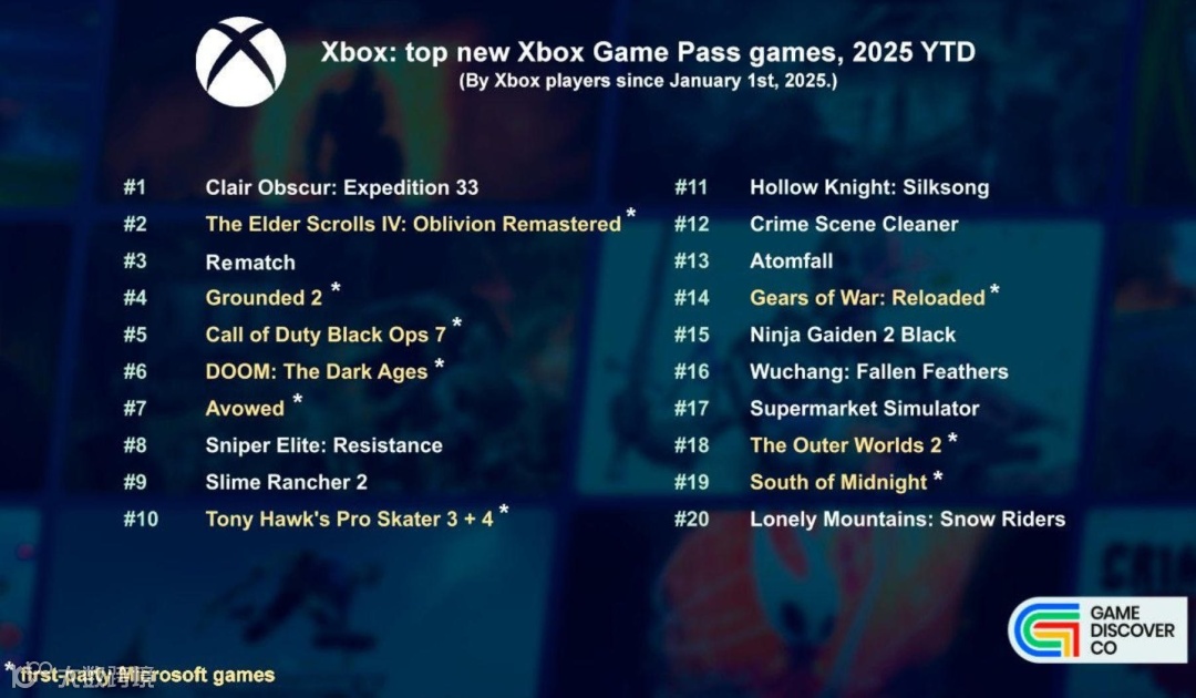 考虑到微软对于订阅服务的重视,Xbox Game Pass的游戏同样值得关注,其中,《光与影:33号远征队》是2025年第三方Game Pass游戏中下载量最高的。(它与《湮没重制版》在最新GP游戏受欢迎度上不相上下。)