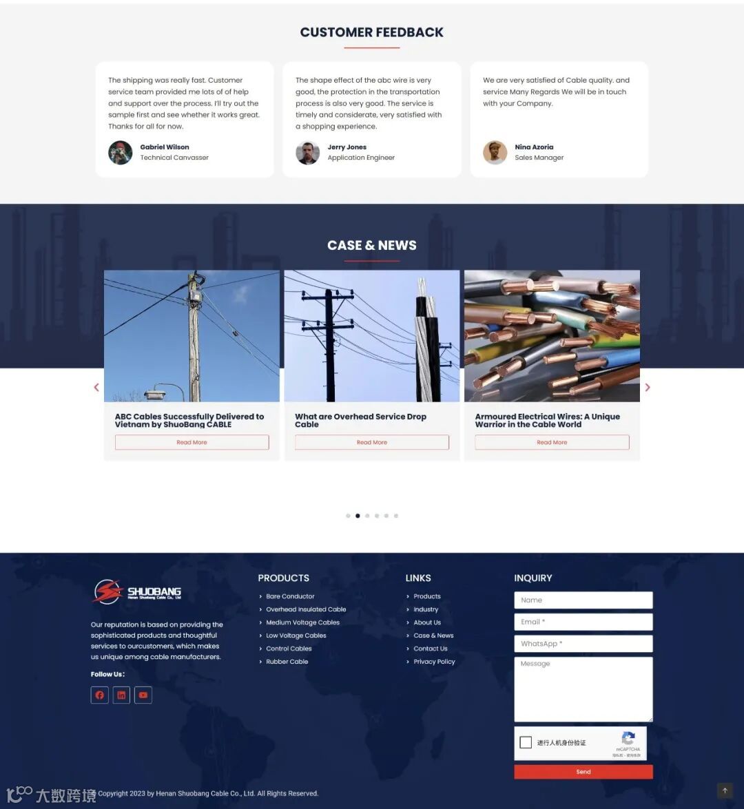 本文展示了一家专业电力电缆与导线制造企业的外贸独立站建设成果。网站全面呈现了企业在铝合金导线、交联聚乙烯电缆、中低压电力电缆、控制电缆及橡胶电缆等核心产品领域的制造实力与全球化市场布局,致力于为国际客户提供安全可靠的产品与一站式解决方案。