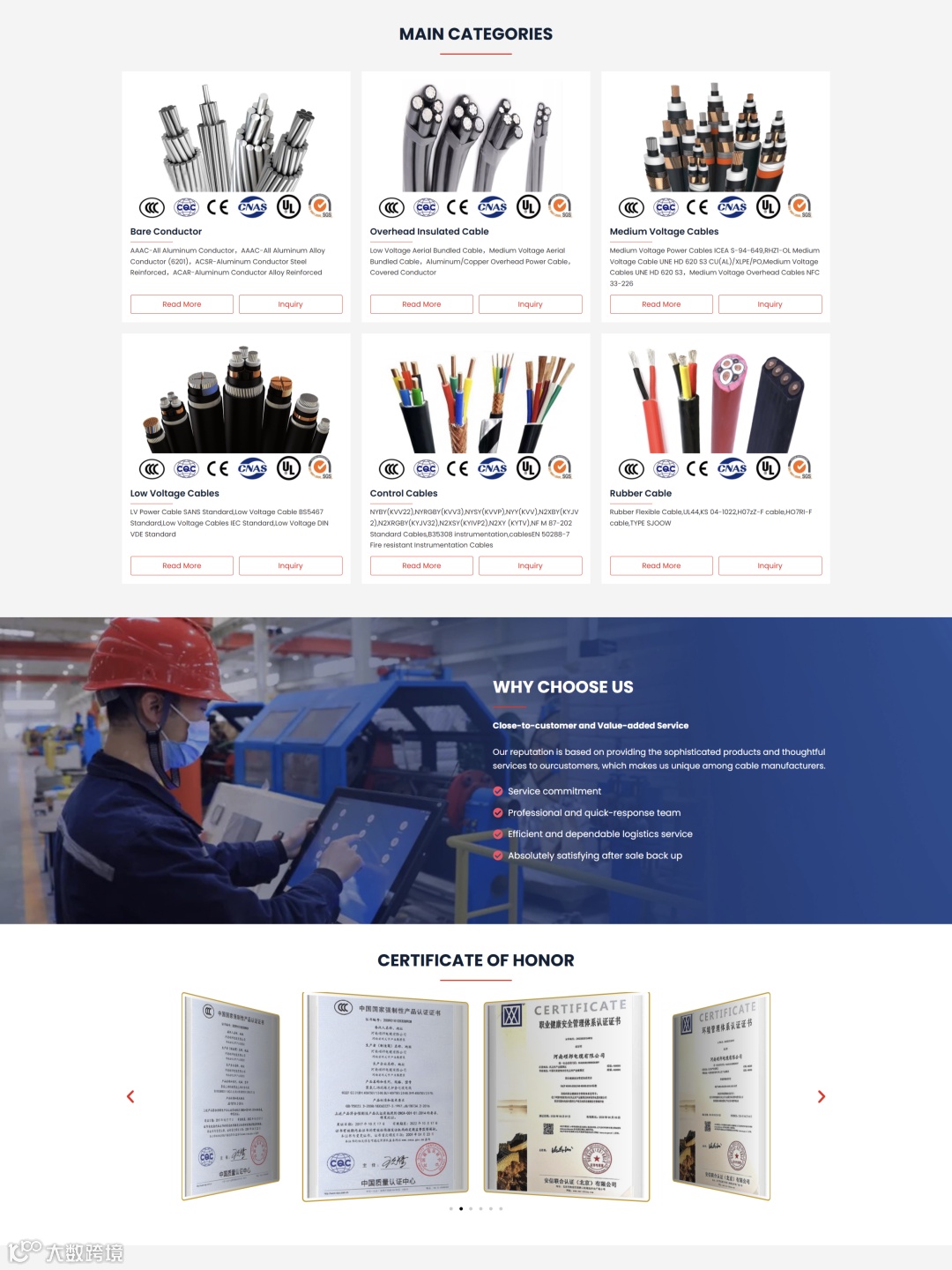 外贸B2B独立站本文展示了一家专业电力电缆与导线制造企业的外贸独立站建设成果。网站全面呈现了企业在铝合金导线、交联聚乙烯电缆、中低压电力电缆、控制电缆及橡胶电缆等核心产品领域的制造实力与全球化市场布局,致力于为国际客户提供安全可靠的产品与一站式解决方案。