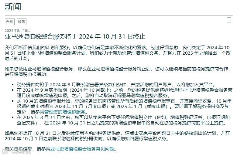 近日亚马逊发布增值税整合服务将于 2024 年 10 月 31 日终止,公告如下: