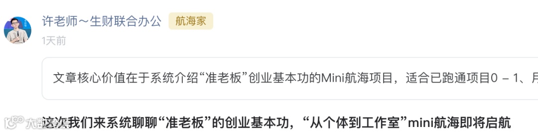 2. 听了坤汀直播间生财联合办公许老师这次准备新开的mini航海直播,关于创业从1-10的一些思维上需要有的转变。