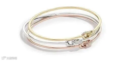 三只互锁C形手镯,中性色电镀处理+少量水晶点缀,低调闪耀;套入式设计,可整体叠戴或单独混搭。