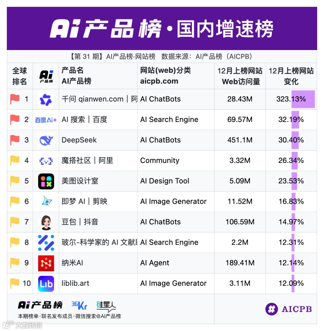 由李榜主发起的全球影响力榜单——AI产品榜,第31期《AI产品榜·网站榜(Web)》(2025年12月榜),由AI产品榜、36Kr、硅星人联合发布。