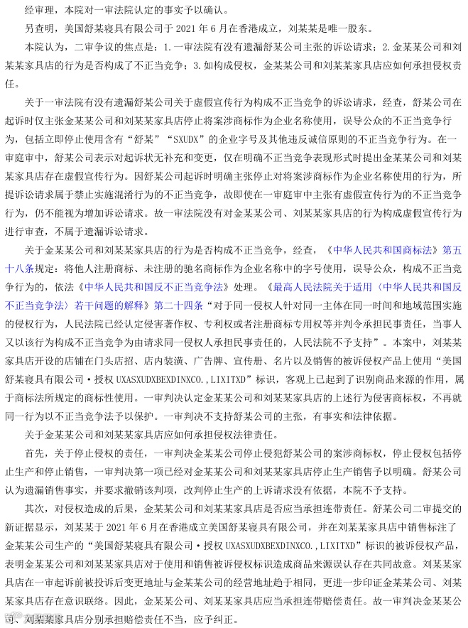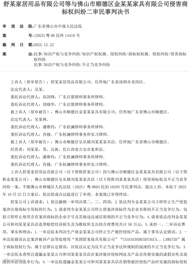 2025年12月22日,广东省佛山市中级人民法院就“舒某”系列注册商标侵权纠纷一案作出终审判决:佛山市顺德区金某某家具有限公司(简称“金某某公司”)与佛山市顺德区乐从镇刘某某家具店(简称“刘某某家具店”)构成对“舒某”注册商标专用权的侵害,应承担共同侵权责任。
