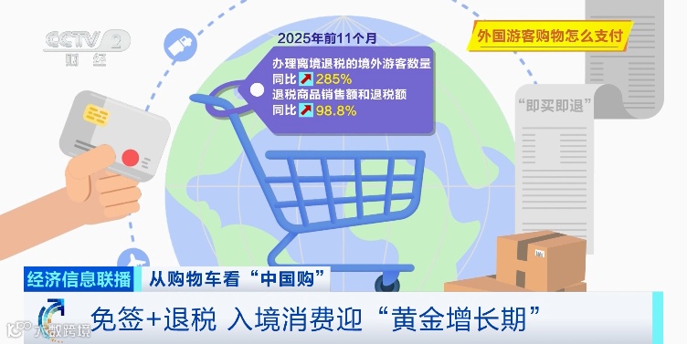 国家税务总局数据显示:2025年前11个月,上海办理离境退税的境外游客数量同比增长285%,退税商品销售额与退税额均增长98.8%。