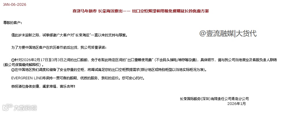 随着2026年农历春节临近,长荣海运(EMC)与日本海洋网联船务(ONE)率先发布《2026年春节期间出口免用箱通知》,明确在特定时段内免除出口重箱使用费,助力外贸企业节前出货。
