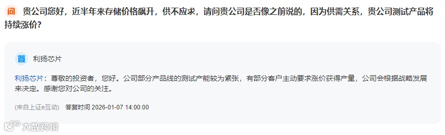 国内芯片测试服务商利扬芯片亦在互动平台披露:部分产品线测试产能紧张,已有客户主动提出涨价以争取排产优先权,公司将依战略规划审慎决策。