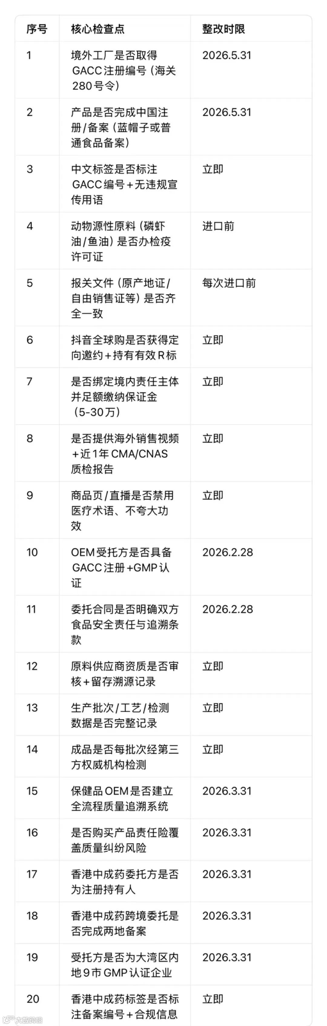 附:跨境健康品合规速查清单(2026核心20项)