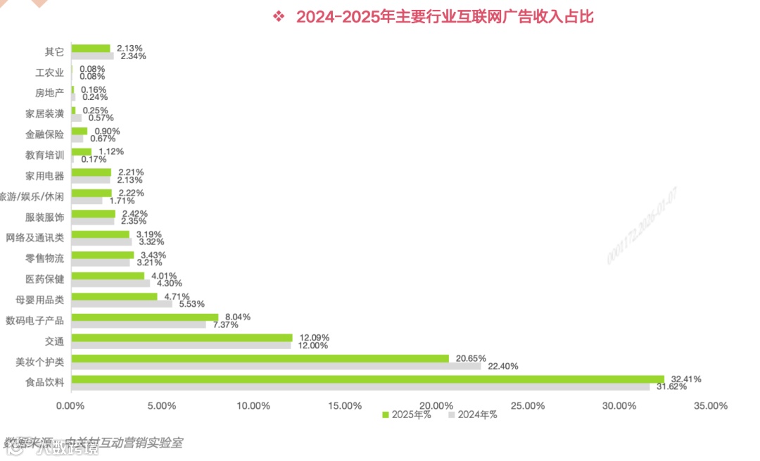 值得关注的是:短视频平台收入首次超越综合电商,成为收入体量最大的单一媒体平台类型;食品饮料、个护及母婴品类合计市场占比达58%,稳居投放主力赛道。