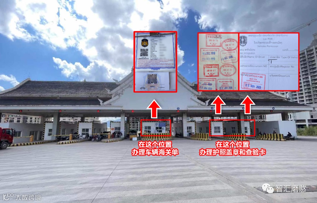 5.完成上述手续后,将车辆开往老挝国门卡口位置,办理老挝车辆海关单、护照盖章、老挝机动车入境查验卡手续(老挝车辆海关单需老挝报关公司办理,请驾驶员提前与老挝报关公司联系)。