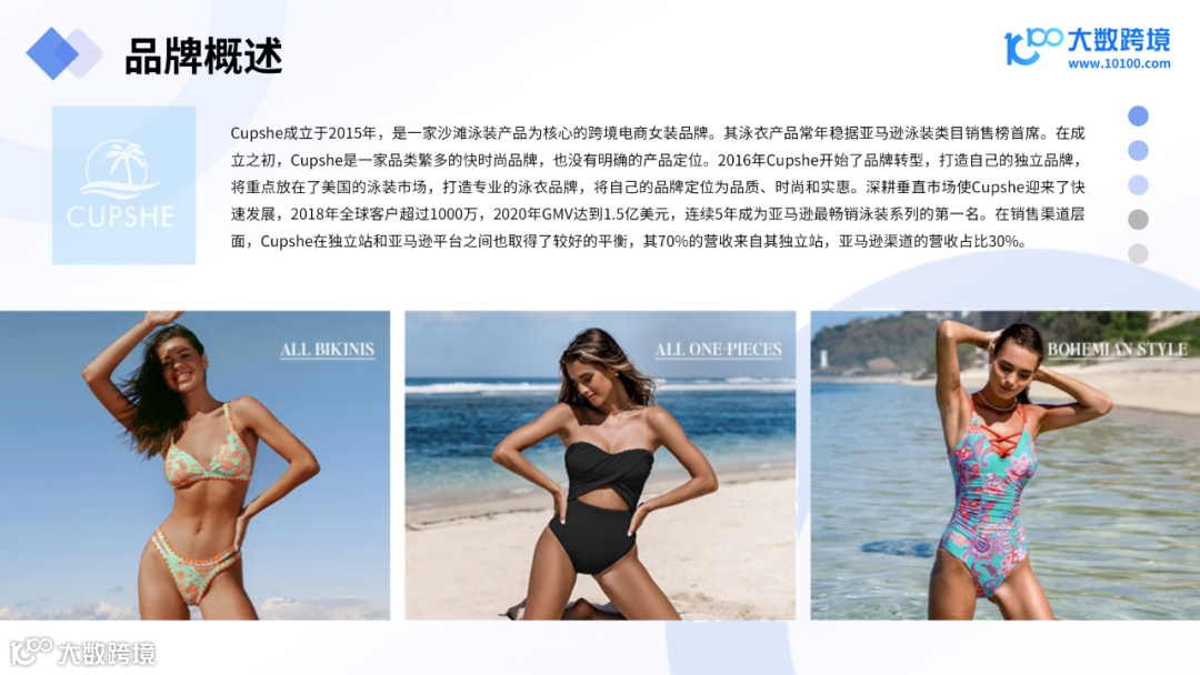Cupshe成立于2015年,是一家沙滩泳装产品为核心的跨境电商女装品牌。其泳衣产品常年稳据亚马逊泳装类目销售榜首席。并连续5年成为亚马逊最畅销泳装系列的第一名。在销售渠道层面,Cupshe在独立站和亚马逊平台之间也取得了较好的平衡,其70%的营收来自其独立站,亚马逊渠道的营收占比30%。