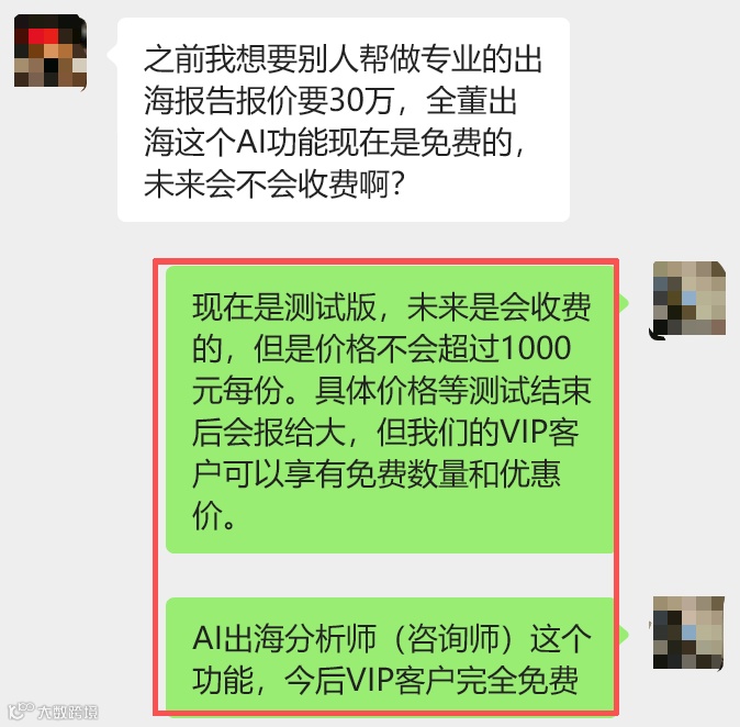 有的人可能会疑惑,别人报价30万,现在咱们免费,未来会不会收费呢?在此明确告知大家,目前提供的是测试版,未来是会收费的,不过价格不会超过1000元每份。值得一提的是,我们的VIP客户可以享有免费报告数量以及优惠价,其中AI出海分析师(咨询师)服务,未来VIP客户更是能完全免费使用。