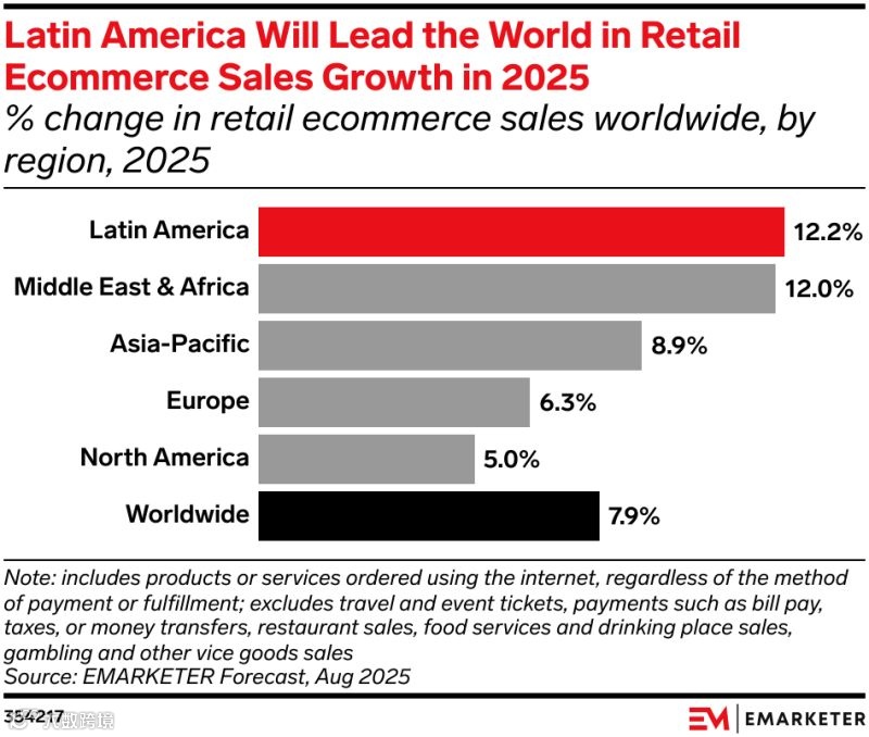 拉美已是全球增长最快的电商市场。eMarketer数据显示,2025年拉美电商增速预计达12.2%,为全球平均水平的1.5倍,时隔四年再度登顶全球增速榜首,并将保持至2027年。