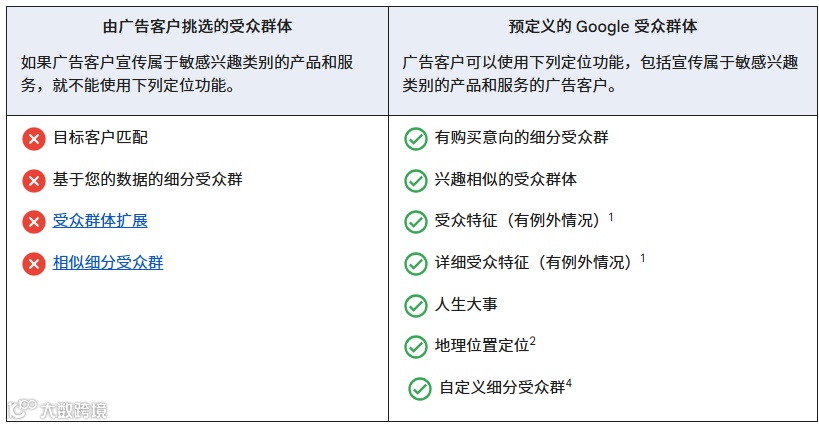 - 涉及敏感兴趣类别的产品或服务(如住房、招聘、消费金融等),须遵守以下限制: