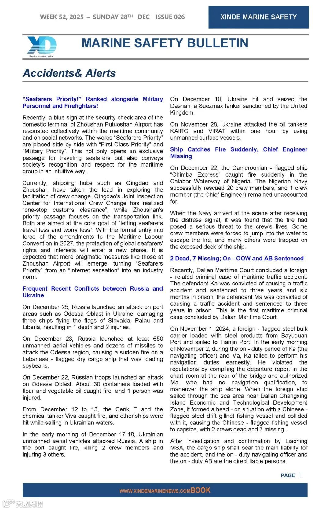 信德海事以“提升海上安全”为使命,持续完善安全资讯服务:2020年8月推出《信德海事安全周报》;2021年1月上线《信德海事安全月报》;2021年2月发布《信德海事安全指南》;2025年7月正式推出中英双语版《MARINE SAFETY BULLETIN》。