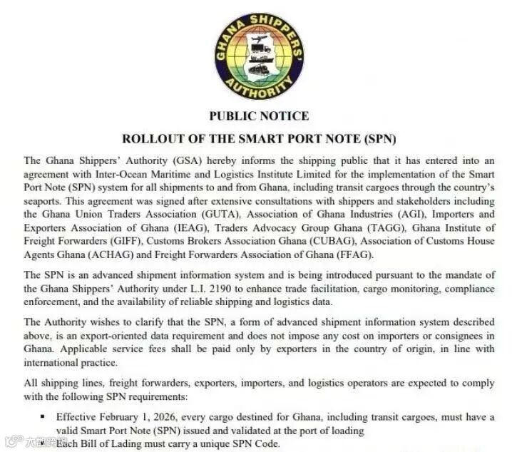 加纳船舶局(GSA)联合跨洋海事与物流研究所有限公司,将于2026年2月1日起正式实施智能港口通知(SPN)系统,覆盖所有进出加纳及经加纳过境的货物。