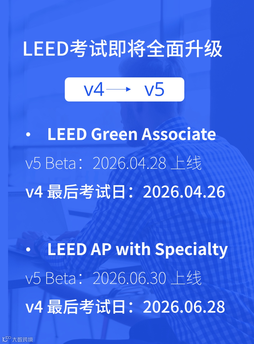 LEED v5 版本已于近期正式推出,LEED AP 考试将于2026年第二季度全面切换至 v5 版本。初期考试仅提供英文单科考试,Beta 测试成绩不即时公布。