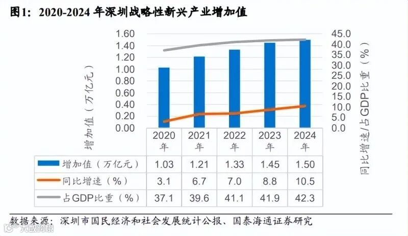 2024年,深圳新质生产力加速成长:战略性新兴产业增加值达10.5%,占GDP比重42.3%;规上高技术制造业、先进制造业增加值分别增长8.9%、11.4%,占比达58.2%、68.2%;高技术产业投资、工业技改投资分别增长24.9%、25.6%;限额以上单位线上商品零售额增长11.2%,占社零总额47.1%。