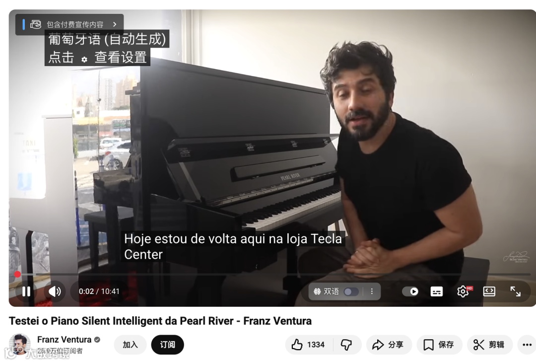 珠江钢琴(Pearl River)拓展葡语市场时,选择巴西钢琴家兼教育家Franz Ventura作为本地化桥梁。他在YouTube拥有28.9万订阅者,以幽默亲和风格面向葡语系国家提供钢琴教学、演奏与产品体验内容,构建起高粘性、高信任度的垂直社群。