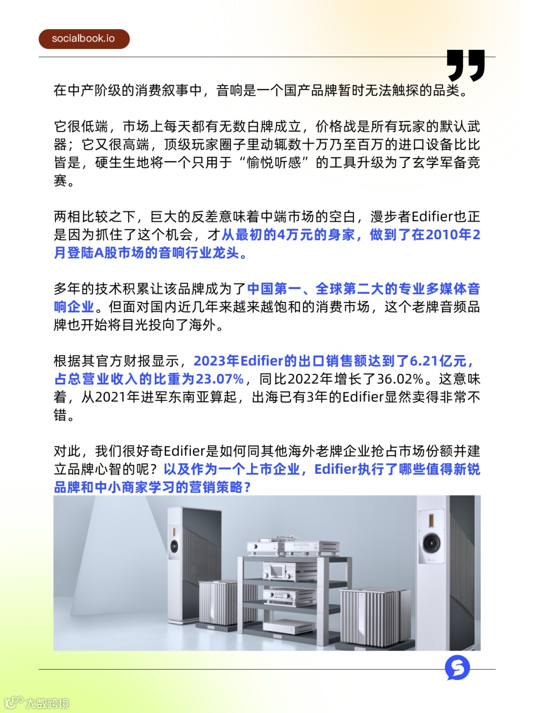 EDIFIER 漫步者是国内首家在A股上市的自主品牌音频企业。