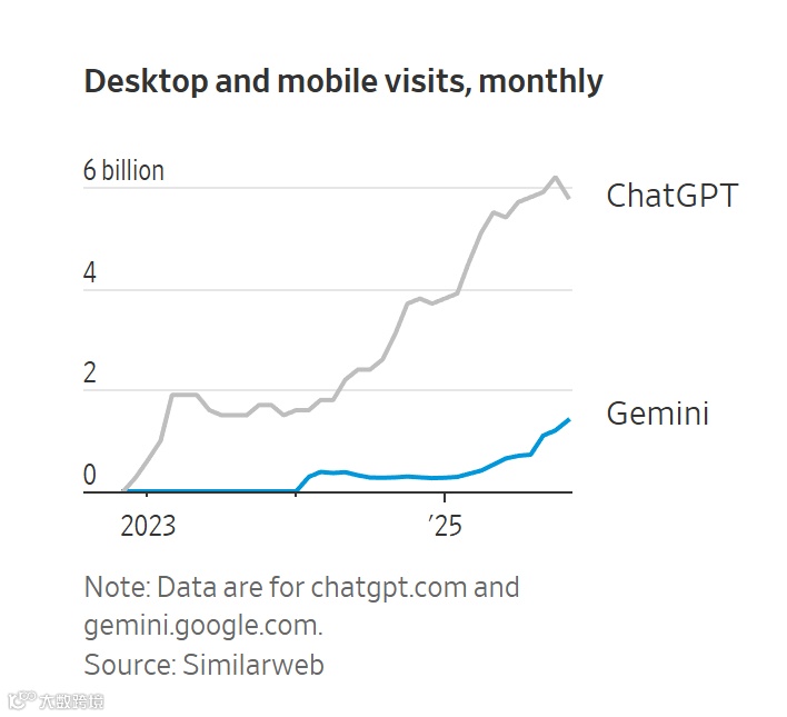 SimilarWeb数据显示:自2025年11月Gemini 3 Pro发布后,Gemini网站流量加速上行,ChatGPT流量持续回落。
