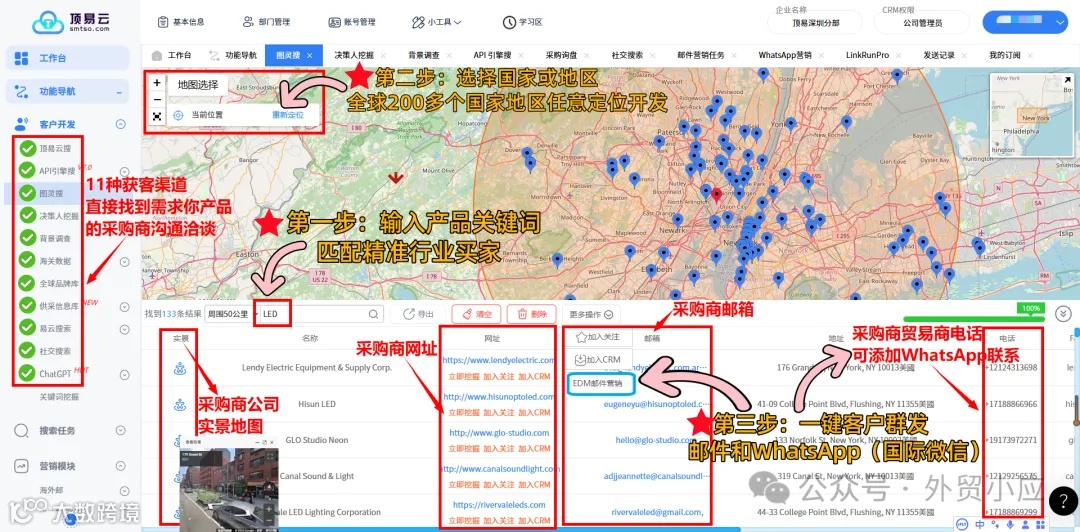 可以根据国家,平台分类,产品关键词去搜客户,如图,会带比较具体的公司明细,还有地址定位,