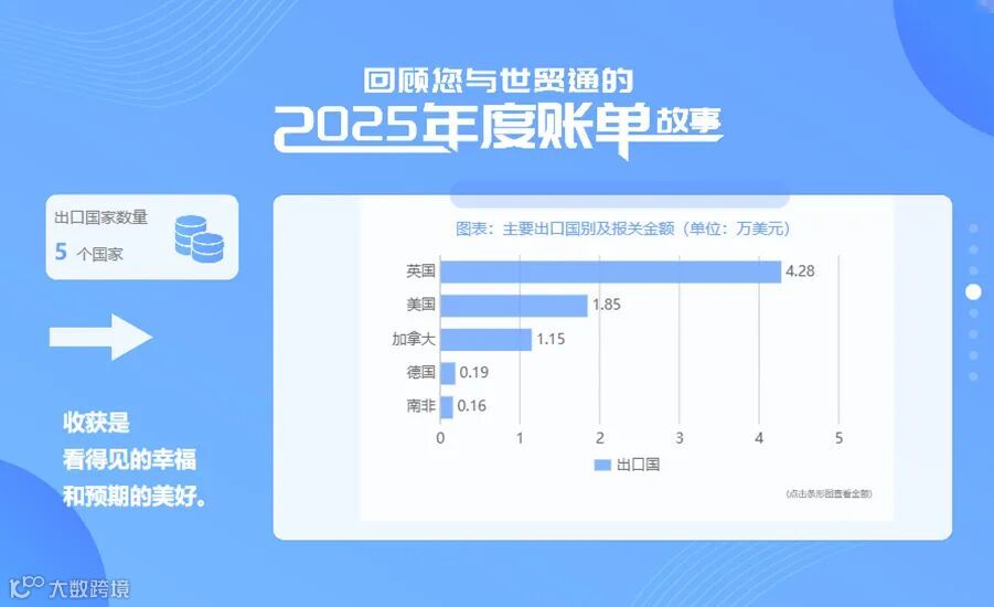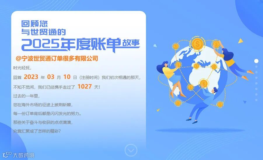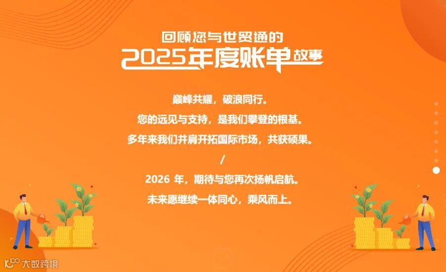 这一年,您走过的海外市场、成交的每一笔订单、顺利通关的每一票货物,我们都为您悉心记录。世贸通2025年度账单现已上线!邀您一起回顾出口路上的重要时刻,为新一年的前行积蓄力量。