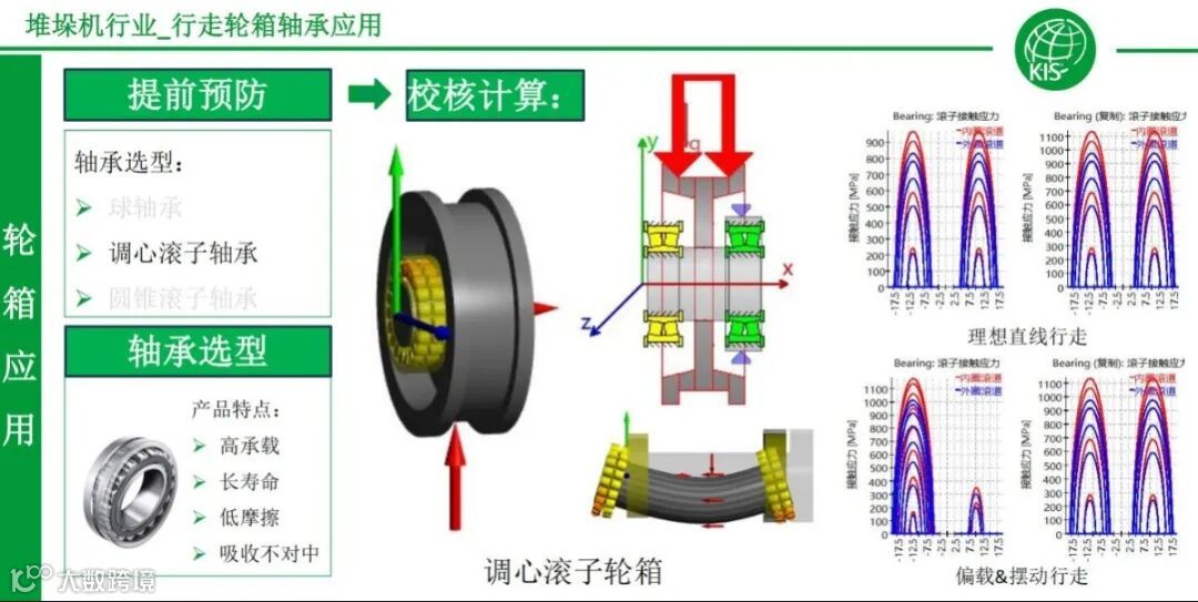KIS通过专业的应用分析软件,以及应用工程师经验,可以帮助客户去做最小型、最优的轴承的选择。如,通过线形图可以分析哪些滚动体受力、有几个滚动体受力、每个滚动体表面的应力是多少?从而选择最合适的轴承。在实际使用过程中,调心轮箱会分为固定端和浮动端,浮动端可以随着受力达到均衡受力,但固定端有可能会出现力的偏载,可以通过演算模拟来选择轴承,从而达到比较稳定的状态。具体到轮箱轴承的选型,有球轴承、调心轴承、圆锥轴承等等,根据不同的速度和承载来进行针对性选择。也就是轴承特性的不同,决定着在不同工况下应该选择什么样的产品。