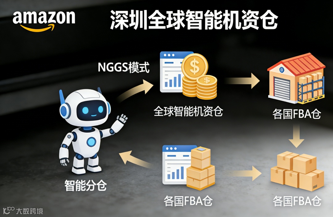NGGS核心“一次上架、一次入仓、全球销售”:货物集中存入深圳全球智能枢纽仓,形成单一库存池,亚马逊AI预判需求并自动分拨至各国FBA仓,可节省20%-40%仓储成本,降低中小卖家布局风险。