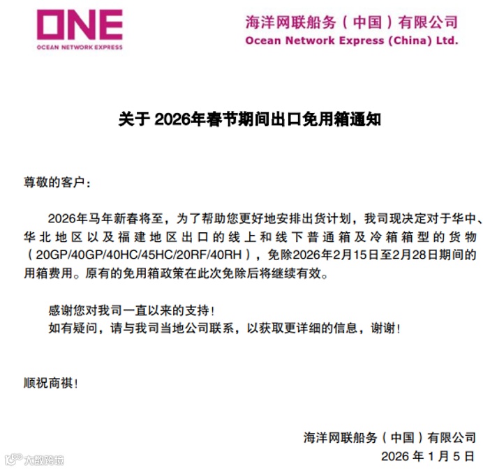 ONE发布的《关于2026年春节期间出口免用箱通知》同样诚意满满。在2026年春节期间,为了帮助客户更好地安排出货计划,ONE决定对特定地区和箱型的货物免除用箱费用: