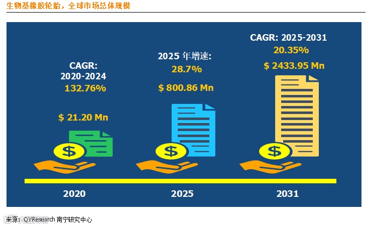 根据QYResearch最新调研报告显示,预计2031年全球生物基橡胶轮胎市场规模将达到24.33亿美元,未来几年年复合增长率CAGR为20.35%。