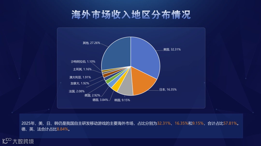 从中国游戏出海收入地区分布情况来看,以美日韩作为主要市场的整体格局并非发生根本变化,三个市场市场份额占比合计达到57.81%,此外,德英法三个欧洲主要市场合计占比达到8.84%。