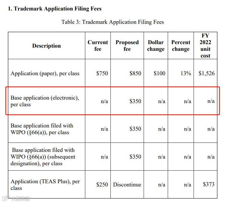 01、正常申请(TEAS Plus):将从每类 250 美金上涨到每类 350 美金,申请一个美国商标的成本将上涨 100 美金(约710人民币),涨幅约为40%