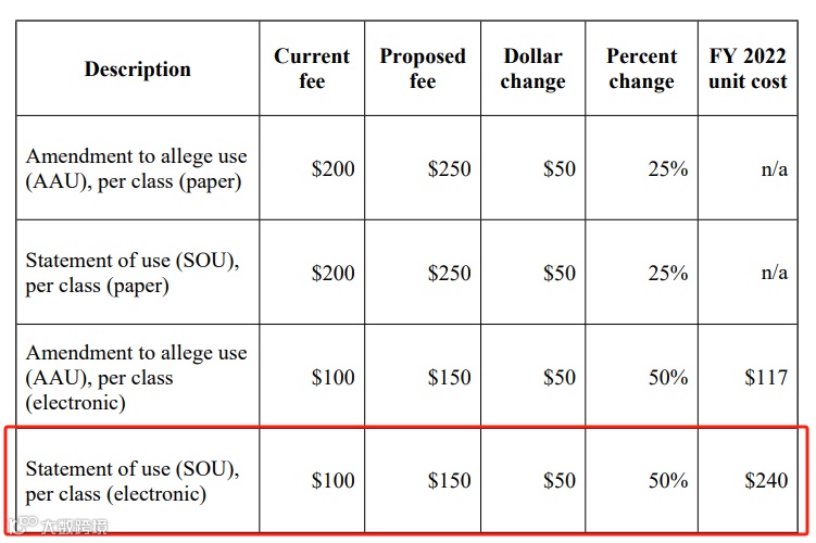 02、意向申请补证据(statement of use):将从每类 100 美金涨至每类 150 美金,上涨 50 美金,涨幅为50%。