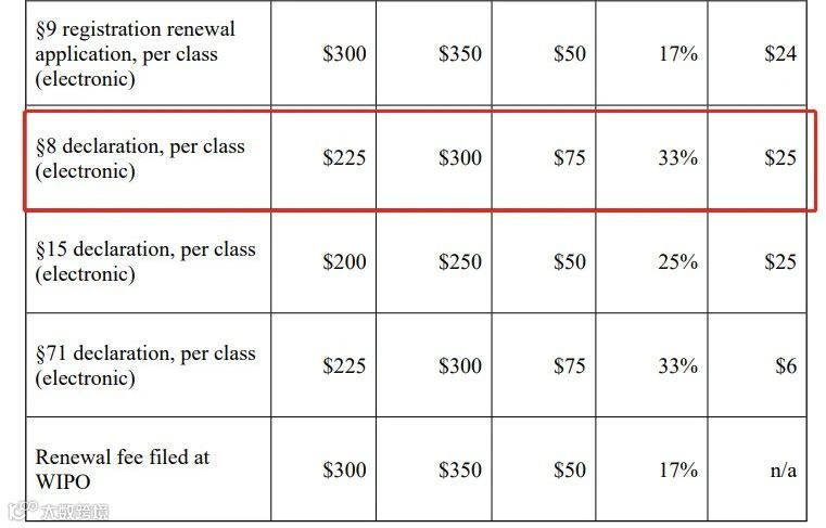 03、5年宣誓费用(§8 declaration, per class):商标5年宣誓费用将从每类 225 美金涨至每类 300 美金,上涨75美金,涨幅为33%,其他年限商标宣誓费用也有不同程度上涨~