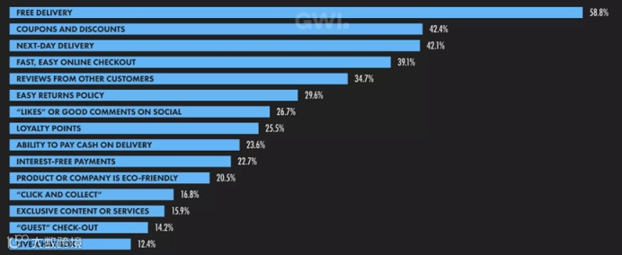 拉美消费者选择线上购物而非实体店主要有5个原因:免费配送(58.8%)、促销折扣(42.4%)、次日送达(42.1%)、便捷的在线支付(39.1%)、用户评价(34.7%),其他的影响因素还有便利的退换货(29.6%)、良好的社媒评价(26.7%)、会员积分(25.5%)、货到付款(23.6%)。