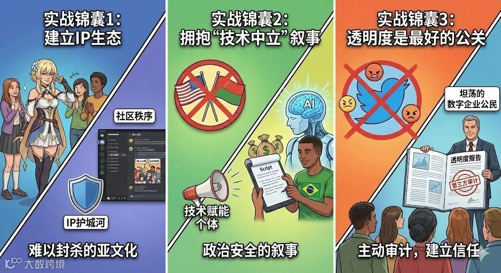不要只盯着买量的ROI看。未来的竞争是IP的竞争。如果我们看看米哈游这样的企业,他们构建了一个由创作者、Coser、攻略作者组成的庞大社区。当你的用户开始自发为作品创作同人小说、并且自发的在Discord里维护社区秩序时,中国数字产业在海外的护城河才算是开始建立起来了。因为平台可以封杀一个App,但很难封杀一种已经生根发芽的亚文化。