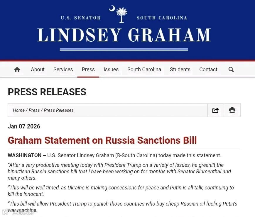 美国当地时间2026年1月7日,美国参议员林赛·格雷厄姆宣布,总统特朗普已批准两党支持的《2025年制裁俄罗斯法案》。该法案拟对所有从俄罗斯进口能源产品的国家加征至少500%的关税,引发国际社会高度关注。
