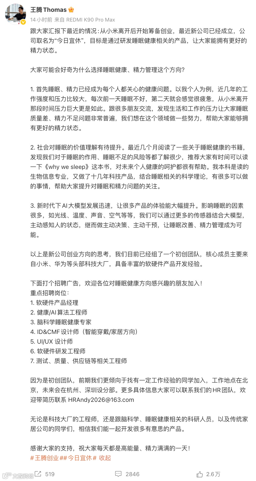 据王腾披露,初创团队核心成员均来自小米、华为等国内头部科技企业,具备多年软硬件一体化产品开发经验。目前,公司已启动软硬件产品经理、健康/AI算法工程师、脑科学睡眠健康专家等岗位的公开招聘,总部设于北京,后续将在杭州、深圳设立分支机构。