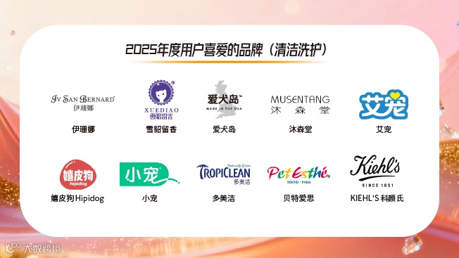 在宠物清洁洗护领域,荣获2025年度“用户喜爱的品牌(清洁洗护)”的获奖品牌有伊珊娜、雪貂留香、爱犬岛、沐森堂、狮王艾宠、嬉皮狗Hipidog、小宠、多美洁、贝特爱思和KIEHL'S科颜氏。
