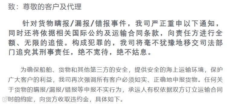 针对货物瞒报/漏报/错报事件,日前,万海航运严正重申通知,将依国际公约及运输合同向责任方全额无限追偿,构成犯罪的移交司法追究刑责,绝不宽待。为保障安全与客户利益,强调客户须如实正确申报货物,否则承运人有权依约收取违约金: