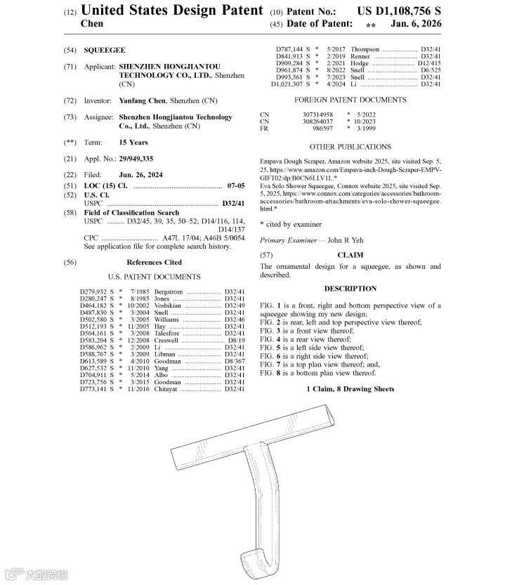 2026年1月6日美国专利局公布一批最新下证美国外观专利,其中包含不少热销产品,比如在亚马逊上月销10K+的刮水刷,专利名称Squeegee,专利号USD1108756S,2024年6月26日申请: