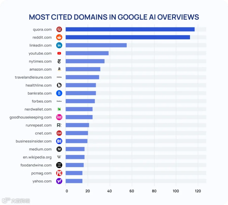 Semrush的报告揭示了2025年AI问答中最常被引用的前二十个来源。除Quora、Reddit、YouTube等社交平台外,其余十二个均为全球知名综合媒体及行业权威垂直博客,可见AI对高权重、高流量网站的重视。